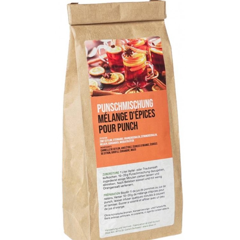 Préparation: Porter à ébullition 1 litre de jus de pomme ou de raisin. Ajouter 10-20g de mélange Punch, couvrir et laisser infuser quelques minutes avant de filtrer. Conseil : affiner avec un peu de jus d'orange.
